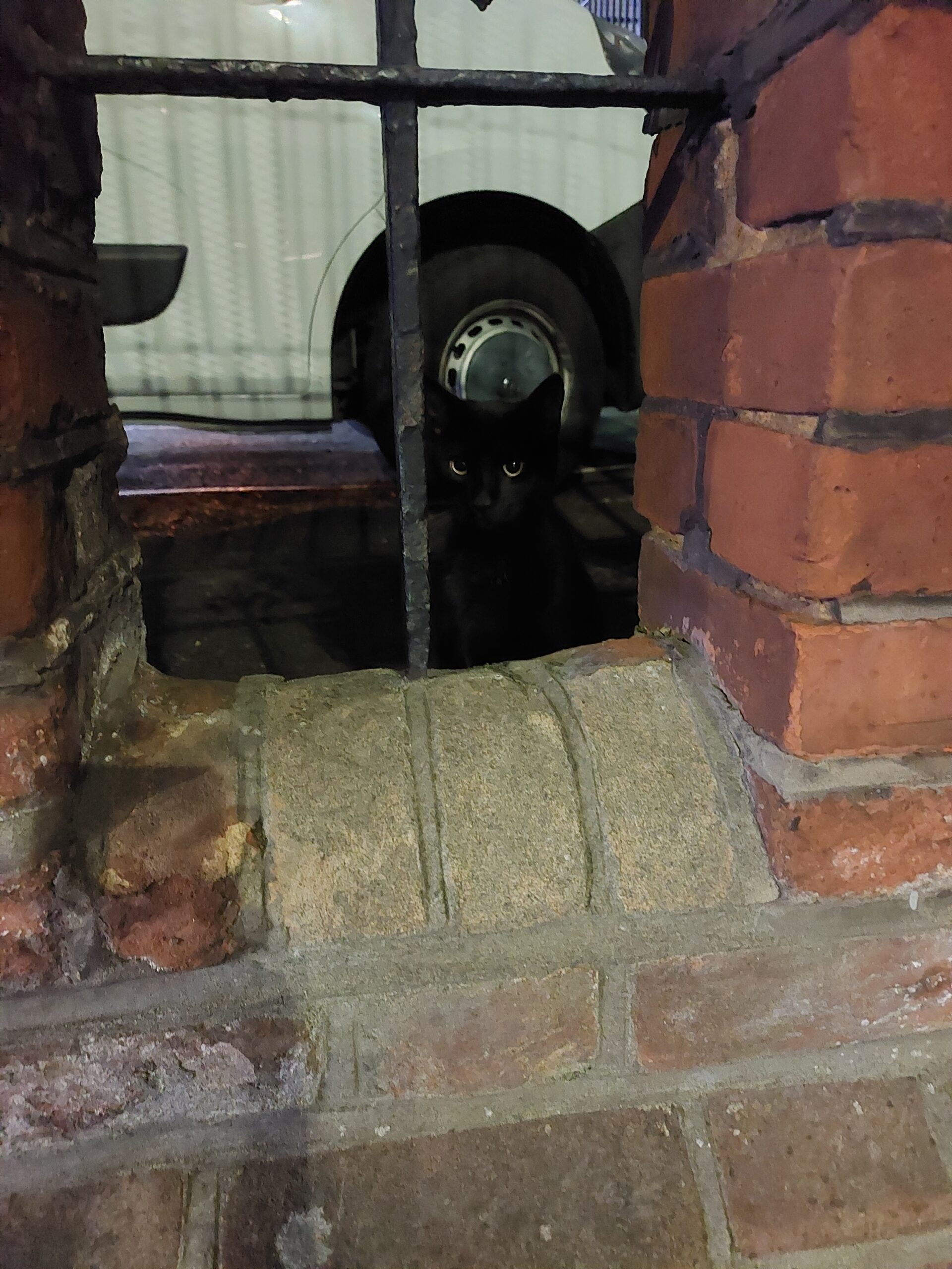 If there is no vehicle to hide under in front of the parade of shops (three in total), the cat can often be found under a vehicle in front of the large detached building next to them. The cat is very nervous but yesterday let me stroke its head for the first time.