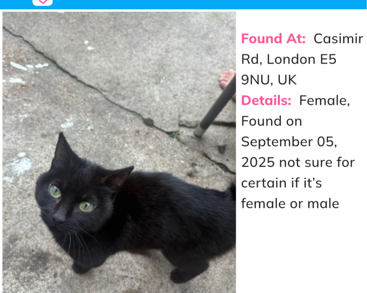 Found Animal: Cat Date Found: 13-09-2025 Location Found: E5 0EQ Current Status: With Myself Found Animal Health Status: Well Circumstances: Young black cat found around E5 0EQ. Very hungry and shy. It looks like she/he